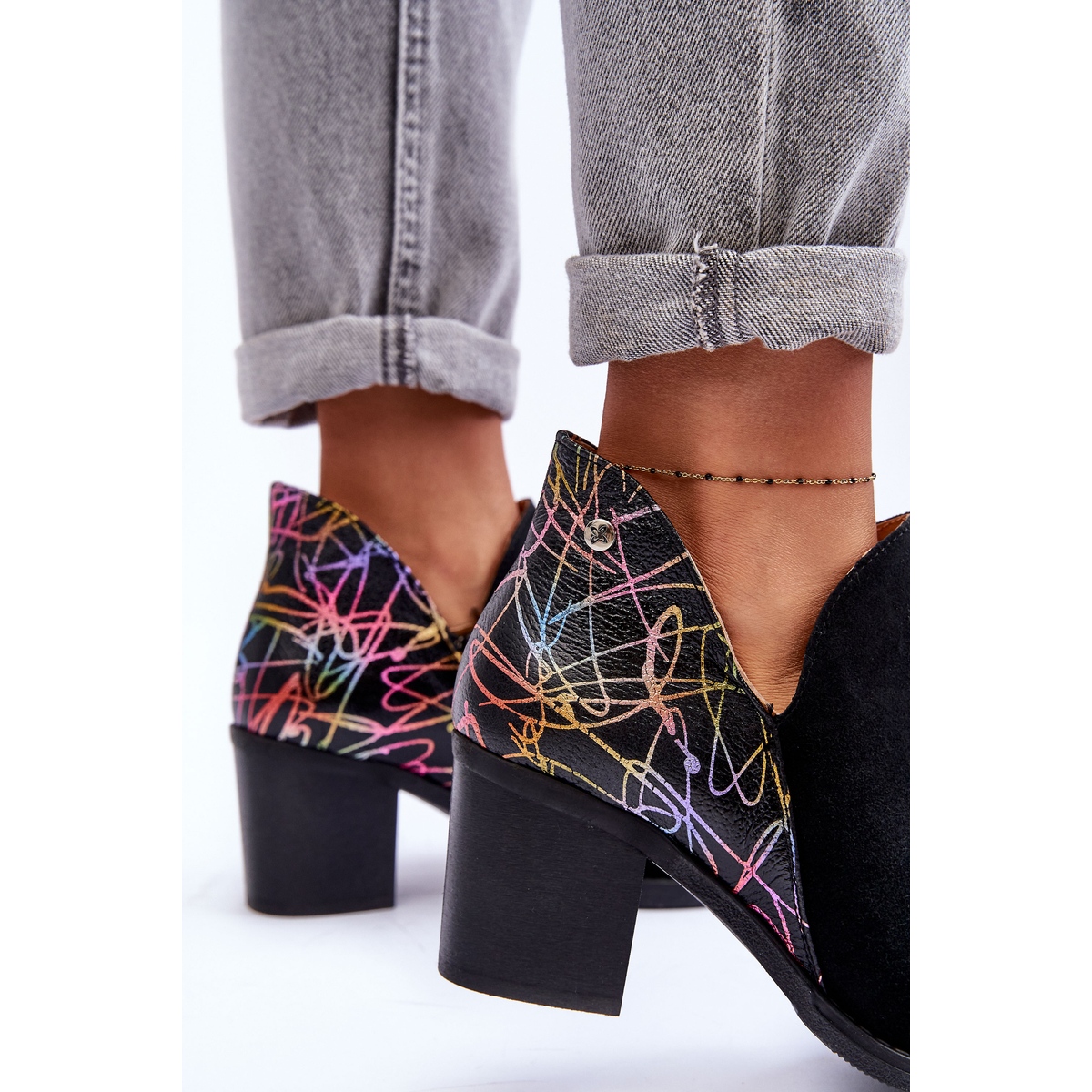 La parte superior decorada de 10 cm de alto con un llamativo patrón multicolor complementará perfectamente cualquier estilo, haciéndote sentir única y elegante. Este modelo se caracteriza por una punta redonda y un cómodo tacón en bloque de 7 cm de altura, lo que hace que las botas sean elegantes y prácticas.
