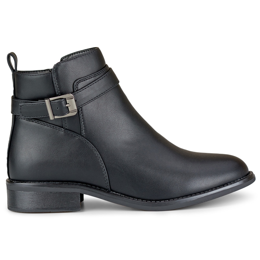 Botas elegantes y atemporales hechas de cuero ecológico en Black Universal. El modelo para el tobillo con un corte simple y suave con una nariz redonda y una suela plana proporciona un aspecto elegante con la máxima comodidad de uso, perfecto para la temporada de otoño/invierno.