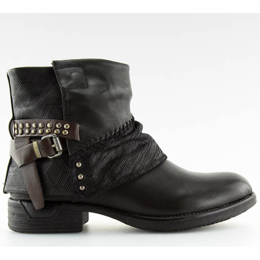 Botas de mujer originales en un tacón plano. Este modelo impresiona con elementos elegantes en forma de un collar único en el frente y correas con hebilla y tachuelas. Serán geniales con todas las estilizaciones casuales al agregarles una garra. Si eres fanático de las soluciones extraordinarias y originales, debes elegir este modelo. Una ventaja adicional es la práctica cremallera en el lateral. Están hechas de cuero ecológico con elementos de tela, y el interior está forrado con una piel delicada.