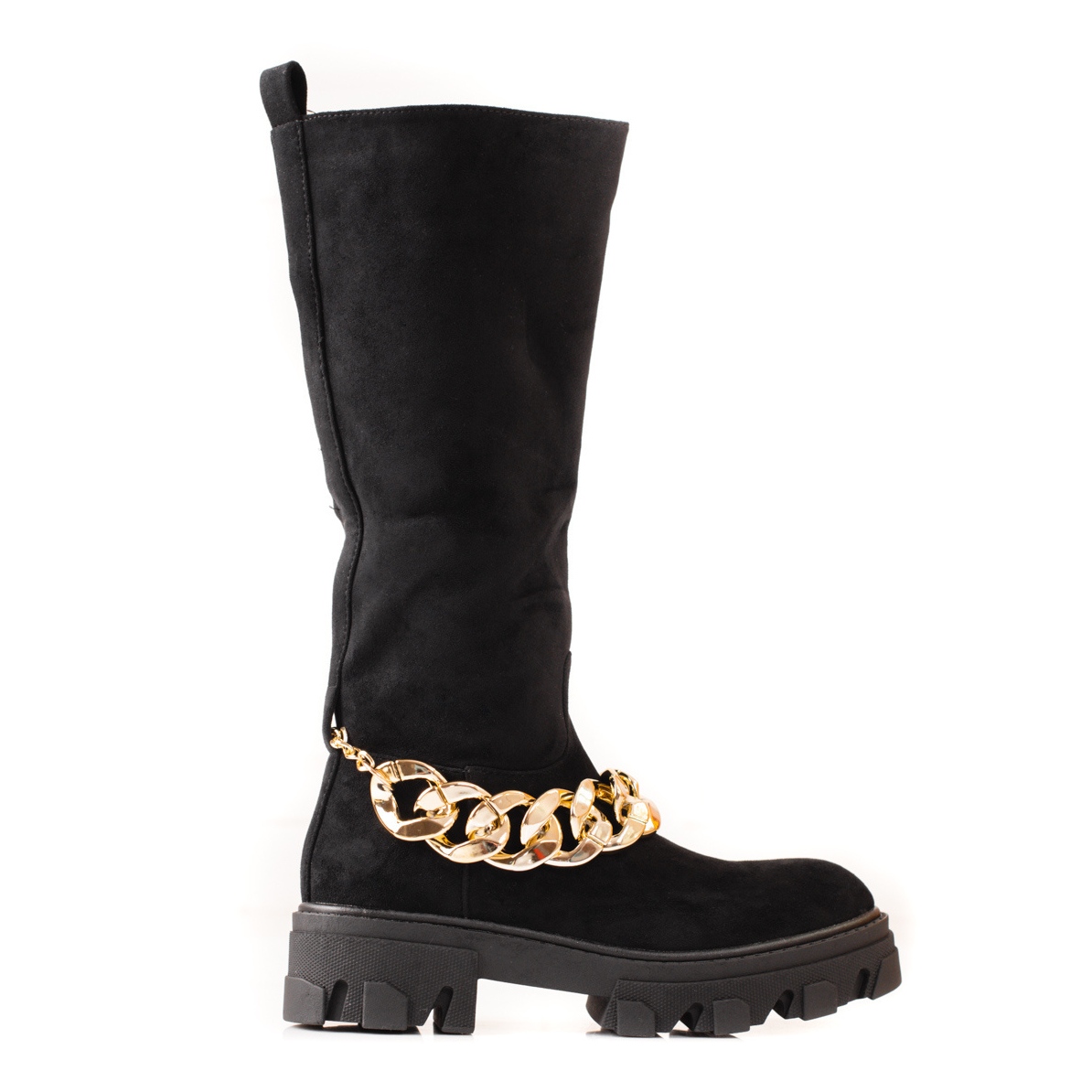 Botas negras para mujeres con una cadena dorada, un clásico con un acento de moda. Botas elegantes y universales de otra marca, perfectas a diario y para estilizaciones más formales. Hecho de semilla ecológica de gamuza negra, decorada con una sutil cadena dorada, que agrega carácter, sin perder el aspecto atemporal.