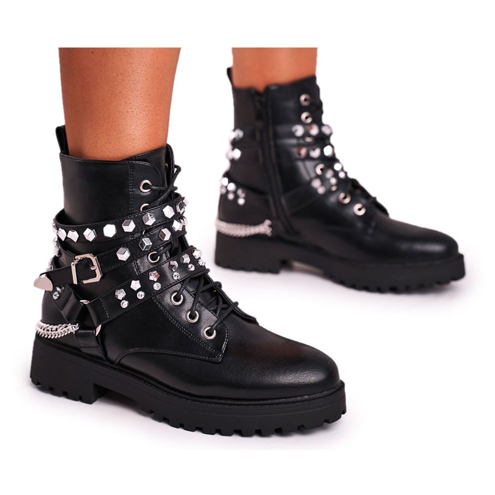Conozca el último modelo de botas de mujer de FB2, que deleitan no solo con estilo, sino también con funcionalidad. Los botines cálidos con cadenas en un elegante color negro son una propuesta ideal para las mujeres que valoran los acentos fuertes en su estilo. Su carácter rockero se acentúa con llamativas rayas decoradas con pedrería plateada y elegantes cadenas, lo que les da un aspecto moderno y vanguardista.