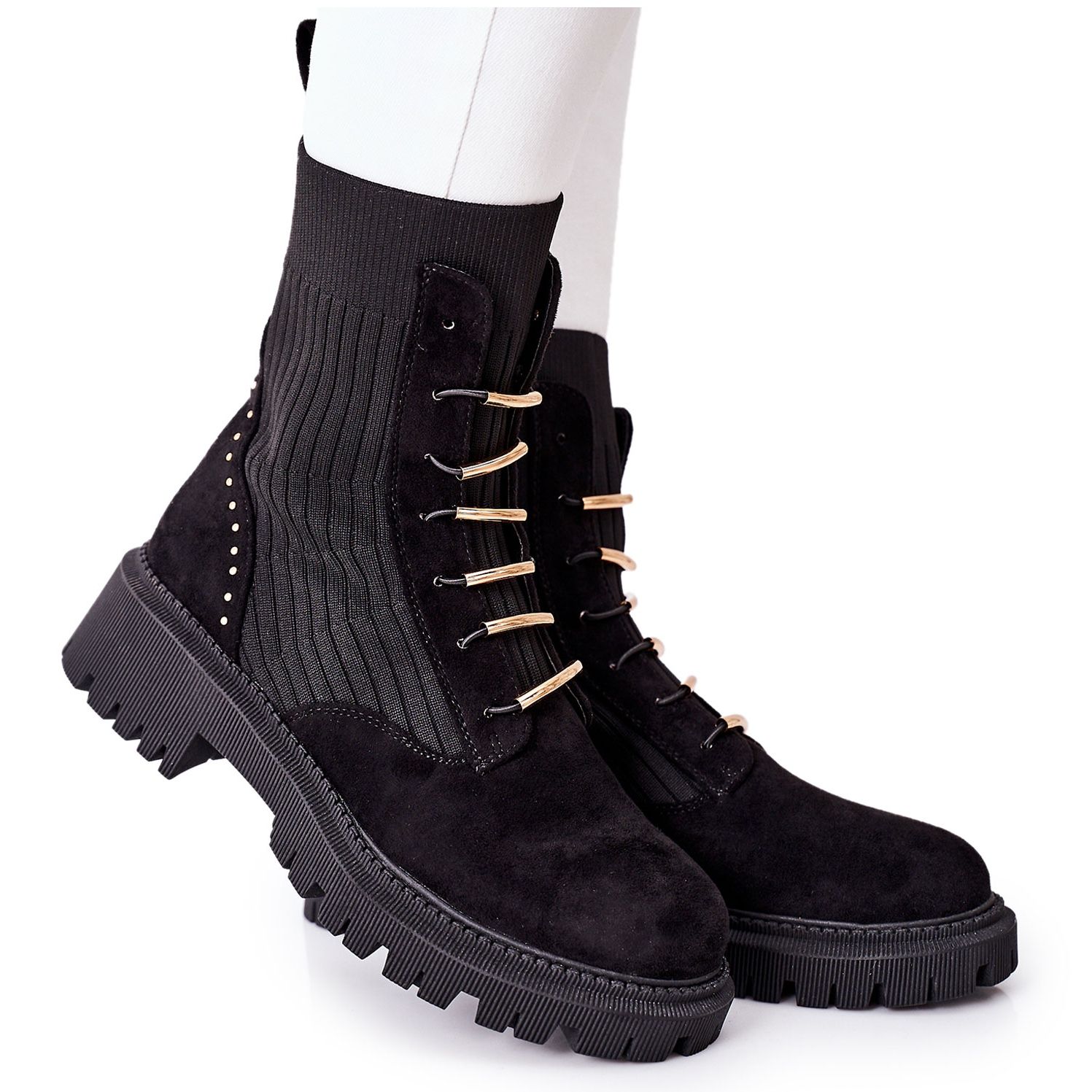 La parte superior tipo calcetín alto, con excelente elasticidad, hace que ponerse los zapatos sea extremadamente fácil y al mismo tiempo asegura un ajuste perfecto a la pantorrilla. Los accesorios dorados enfatizan sutilmente su estilo único, haciéndolos extremadamente elegantes y a la moda.