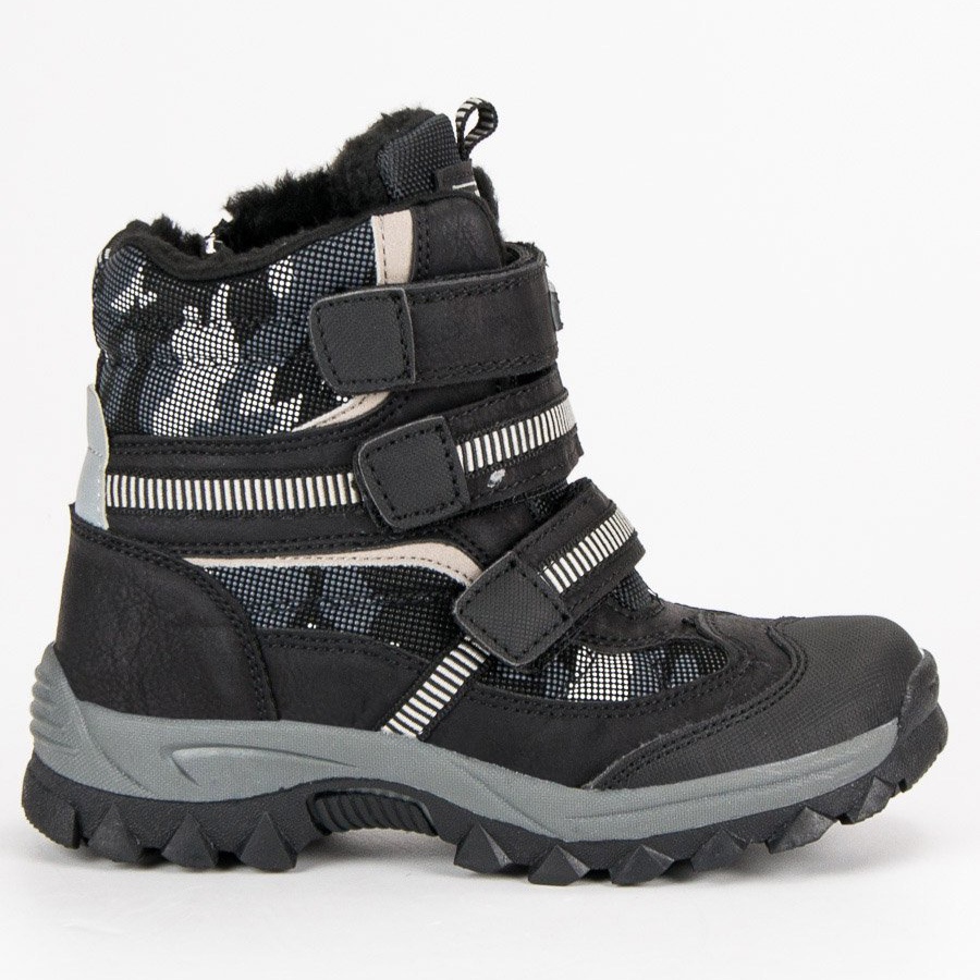 Las botas de nieve de terciopelo negro de American Club son cómodas botas para niños para la temporada de otoño e invierno. Gracias al cálido y cómodo forro de piel, el calzado presentado se adaptará perfectamente a la situación cuando la temperatura sea baja en el exterior. El calzado está hecho de cuero ecológico y material textil.