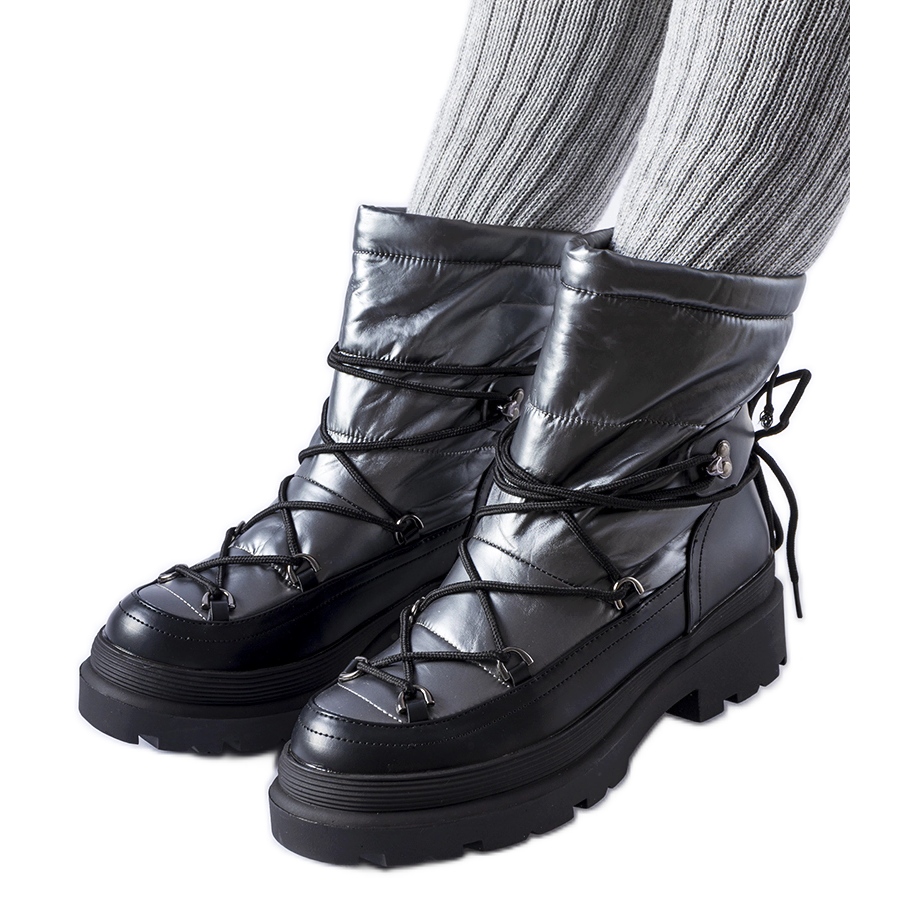 Las botas de nieve modernas de Eagleville combinan un diseño progresivo de moda con soluciones prácticas necesarias en los días fríos. Hecho de un sintético duradero, con un inserto suave y aislado, proporcionan comodidad térmica y comodidad de usar incluso durante las heladas. La estructura insertada con el ribete en la parte superior le permite combinar rápidamente el zapato con la pierna y proteger contra el frío. El color negro y gris (NE/Grigio) con una suela negra da un aspecto universal y de deportes urbanos, fácil de combinar con diferentes estilos.