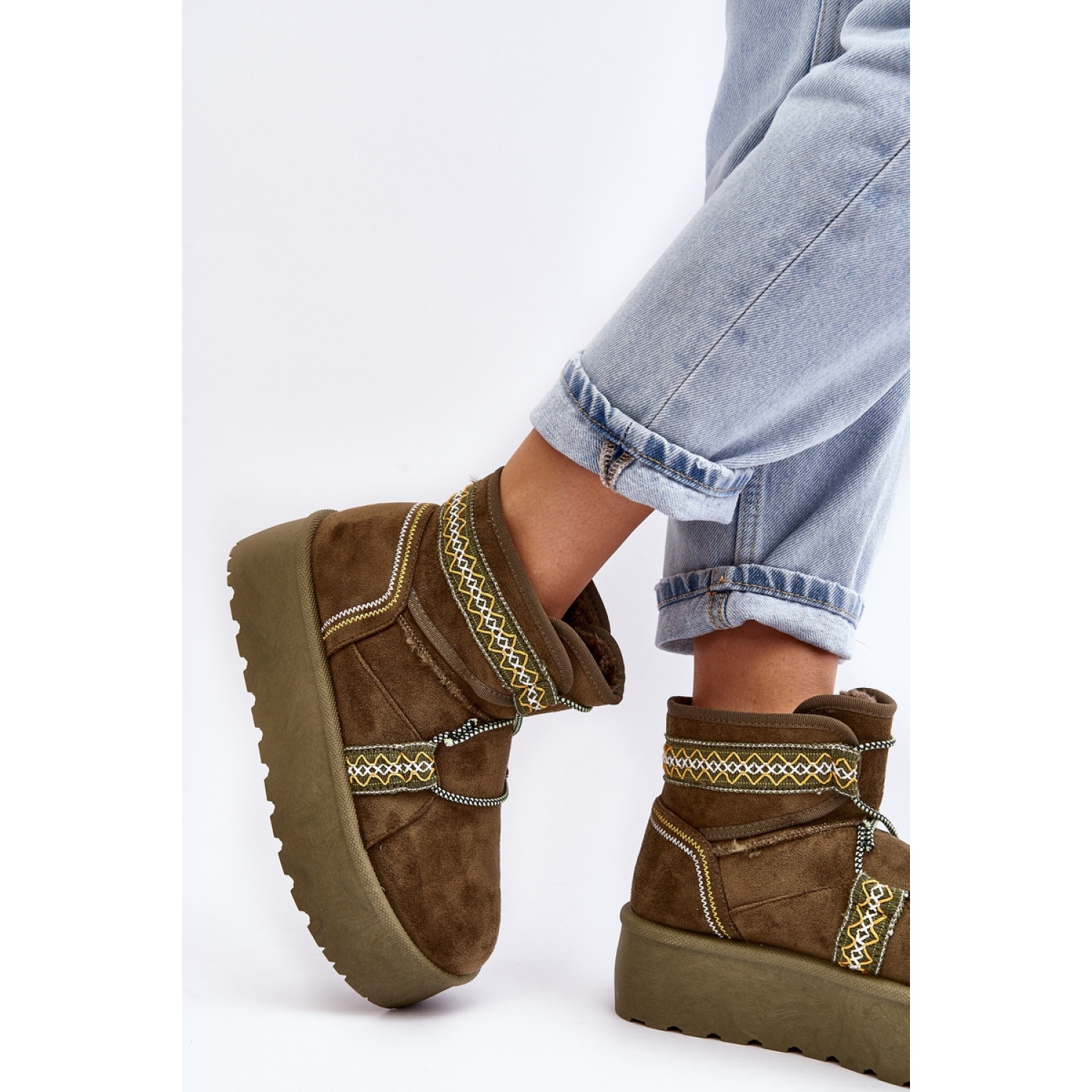 Botas de nieve para mujer con un estampado moderno y cordones en la parte superior. Confeccionado en ante ecológico. Ubicado sobre una enorme plataforma hecha de material de goma, que te aísla perfectamente del frío suelo. Parte superior hasta el tobillo. El interior está aislado con piel. ¡Debes tenerlos!