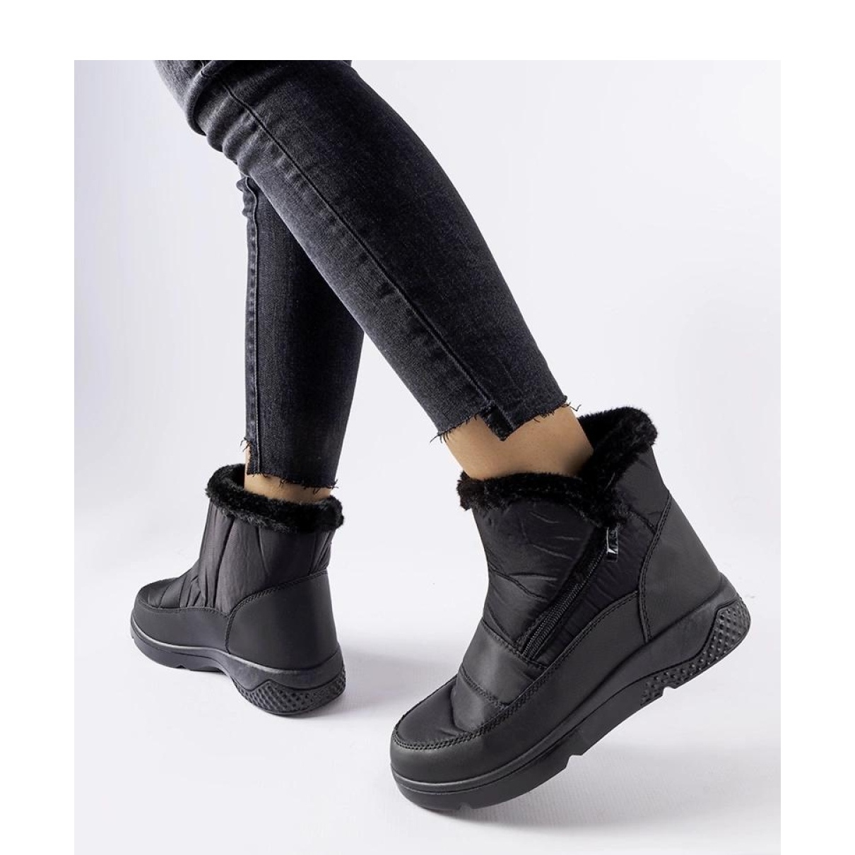 Descubra la combinación perfecta de estilo, comodidad y funcionalidad con botas de nieve aisladas negras con una cremallera, ideal para los días de invierno. Estos elegantes zapatos de alto diseño, alcanzando el tobillo, protegen efectivamente contra la nieve y la humedad, y su nariz redonda agrega estilo a cualquier estilización.