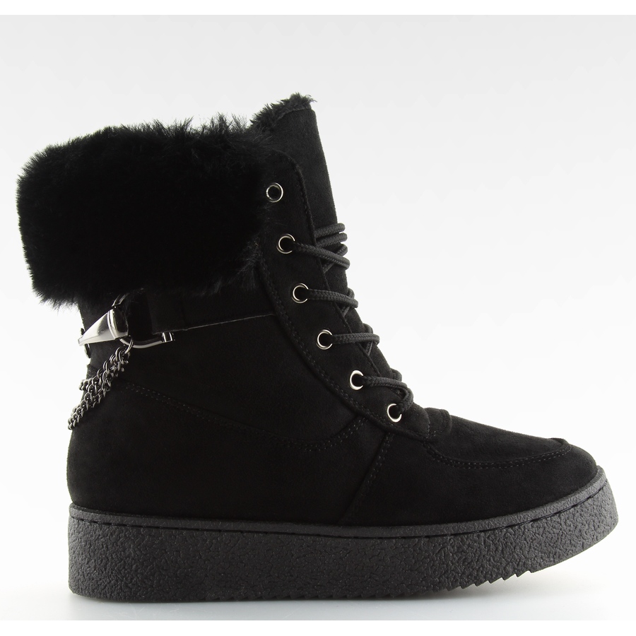 Botas de nieve con cordones para mujer en una suela alta que aísla perfectamente del suelo. Están confeccionadas en ante ecológico, aislado con piel gruesa, por lo que el calor en los días fríos está garantizado :). El elegante pelaje alrededor de la parte superior y las cadenas en la parte posterior le dan originalidad a los zapatos. Un modelo muy cómodo.