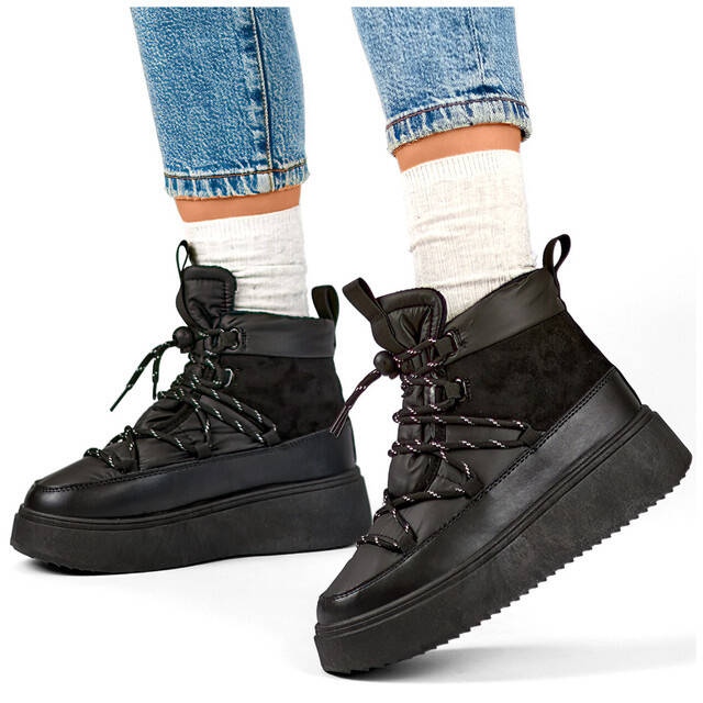 Estos zapatos de invierno han sido diseñados para usuarios que valoran tanto el estilo como la funcionalidad. Tienen una plataforma plana con una altura de 4.5 cm, lo que garantiza la estabilidad al caminar sobre nieve o superficies resbaladizas. El cierre de encaje -UP permite un ajuste perfecto para el pie, y la nariz redonda le permite mover los dedos libremente.