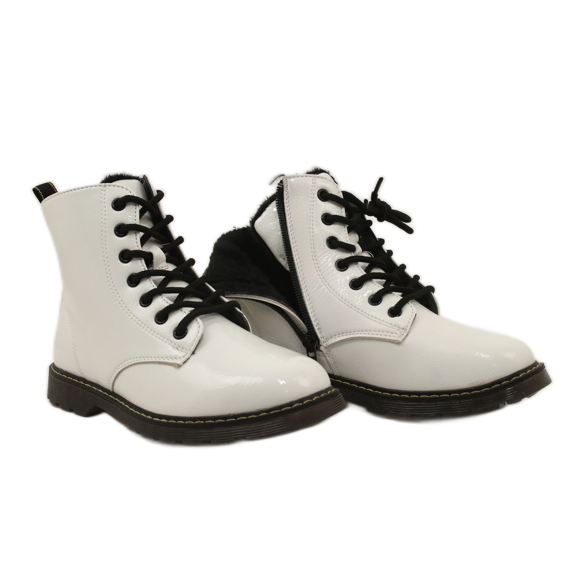 Elegantes, las chicas Miss botas hechas de cuero ecológico blanco de alta calidad con acabado barnizado. El modelo está aislado con un pelaje suave de calzado de Evento: el inserto y el interior del zapato aseguran el calor y la comodidad en los días más fríos.