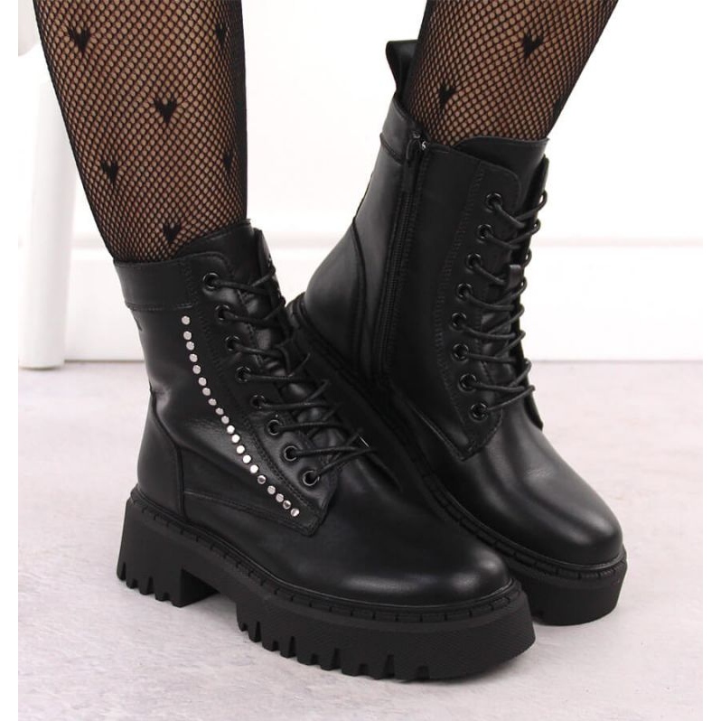 Detalles como la pedrería dan a las botas un carácter único, y los elementos de cremallera y cordones permiten un ajuste perfecto al pie. Este modelo está disponible en medidas estándar, lo que facilita la compra.