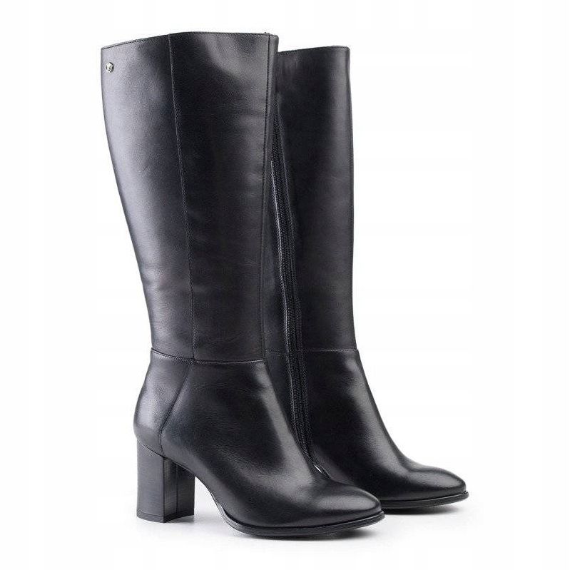 Un encanto adicional les da la altura total del zapato de 35,5 cm y la circunferencia de la parte superior en la parte superior (talla 37) de 37 cm, gracias a lo cual los zapatos se ajustan perfectamente a la pierna y se adaptan a varios tipos de mujeres. cifra. La puntera almendrada les confiere un carácter sutil y el tacón bloque de 7 cm de altura unifica elegantemente la silueta sin reducir el nivel de comodidad.