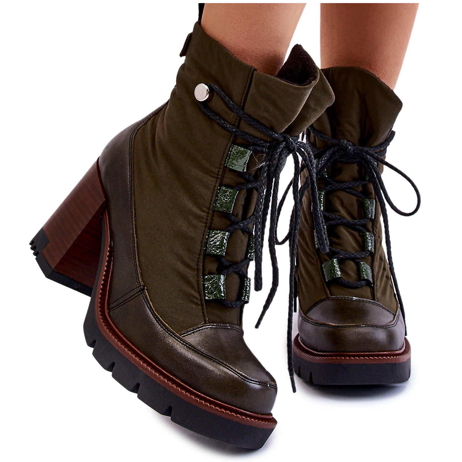 Este modelo se caracteriza por un tacón en forma de poste con una altura de 8,5 cm, lo que le aporta elegancia y al mismo tiempo le asegura estabilidad. Las botas son prácticas y funcionales: se cierran con cremallera y tienen cordones, lo que permite calzarlas y ajustarlas fácilmente a la pierna. La nariz cuadrada cumple con los requisitos de las tendencias modernas y el color verde encajará perfectamente en varios estilos.