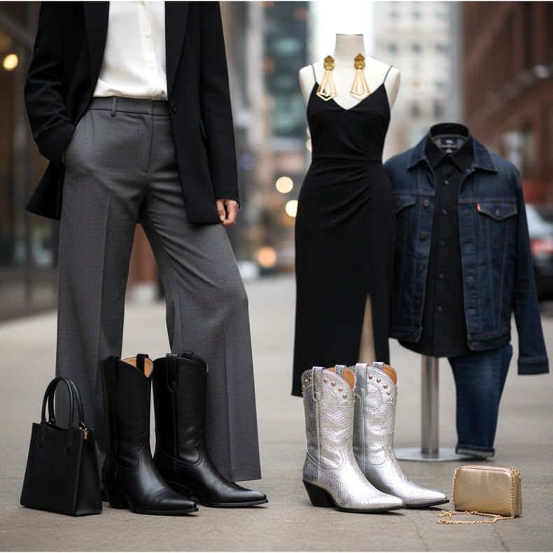 Para las salidas nocturnas, elige botas cowboy de material brillante o con detalles metálicos. Las botas vaqueras doradas o plateadas combinadas con un vestido midi negro crean un efecto dramático pero elegante. No se olvide de los accesorios adecuados: aretes grandes y un bolso minimalista con cadena completarán este estilo.