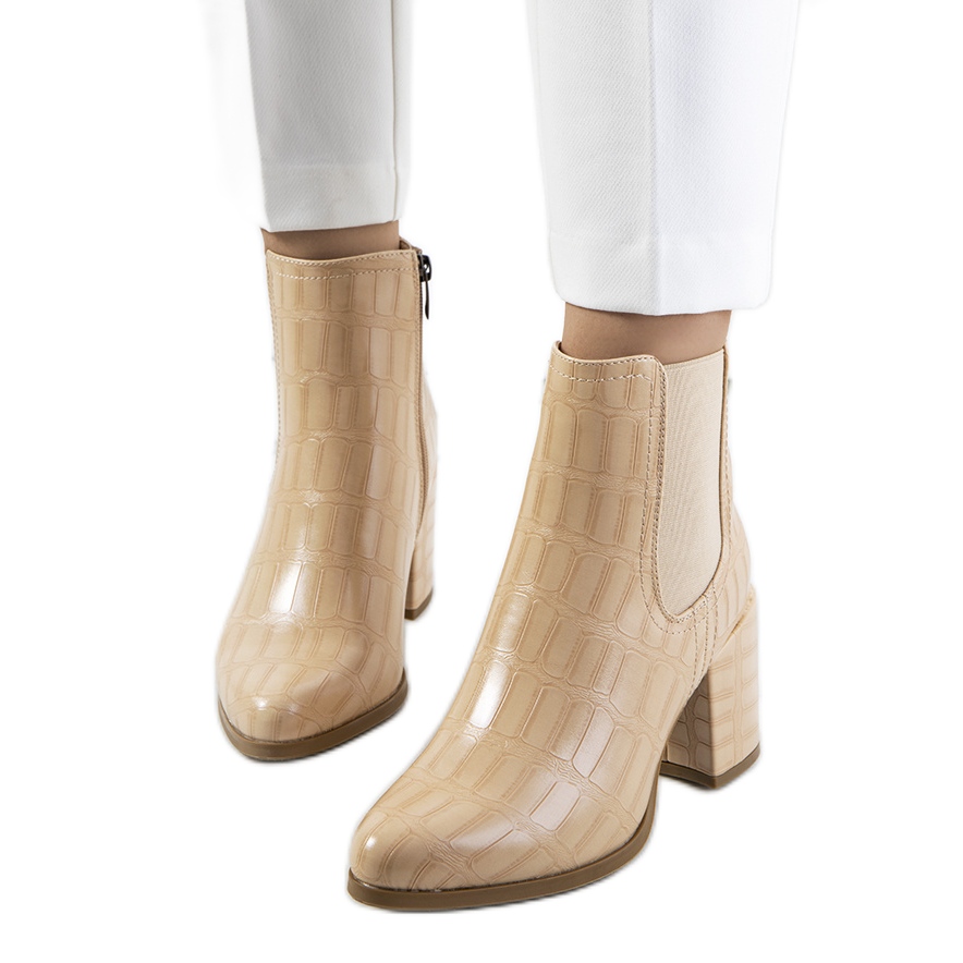 Botas clásicas de Easthaven en beige hechas de cuero ecológico. Un modelo con una nariz sutil y puntiaguda, incrustada en un poste estable (7 cm), ligeramente aislado desde el interior, la elección perfecta para las estilizaciones de otoño e invierno. Un sujetador de cremallera desde el interior asegura cómodo colocando, y la presión de la piel del cocodrilo que imita la piel agrega un personaje elegante a los zapatos.