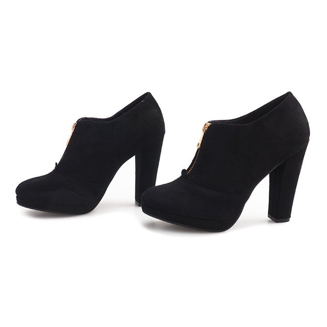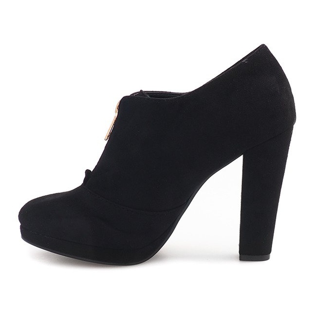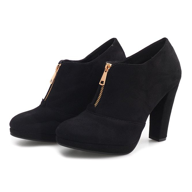 Descubre los botines de tacón VX-62, extremadamente femeninos, en un moderno color negro, que son el complemento perfecto para cualquier estilismo. Estos elegantes zapatos con una línea ligeramente rebajada hacia la puntera se distinguen por una cremallera dorada en la parte delantera, que les aporta un carácter único.