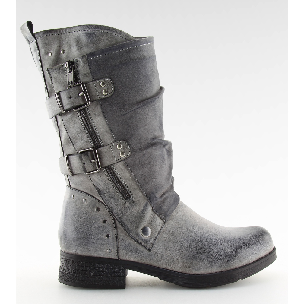 Botas de mujer con una parte alta de estilo grunge. La combinación original de cuero ecológico y gamuza ecológica y el cuello arrugado más moderno con hebillas realza el estilo militar de estos zapatos. Además de su apariencia llamativa, se distinguen por un cálido forro de piel en el interior, que brindará calor incluso en los días más fríos. Esta temporada es una moda que debe tener! Una práctica cremallera en el lateral es otra de las ventajas de estos zapatos.