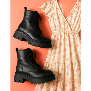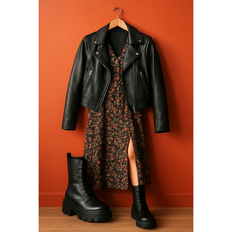 La combinación de botas de trabajo pesadas con un delicado vestido floral es un clásico que siempre funciona. Elija un vestido midi o maxi con una abertura que dejará al descubierto la parte superior del zapato. Añade una chaqueta motera de cuero o una chaqueta de gran tamaño. Este conjunto es el equilibrio perfecto entre el estilo rockero y el estilo romántico de niña. Recuerde no exagerar con los accesorios: los zapatos son un acento bastante fuerte aquí.