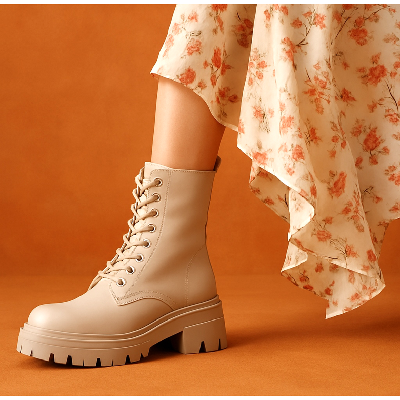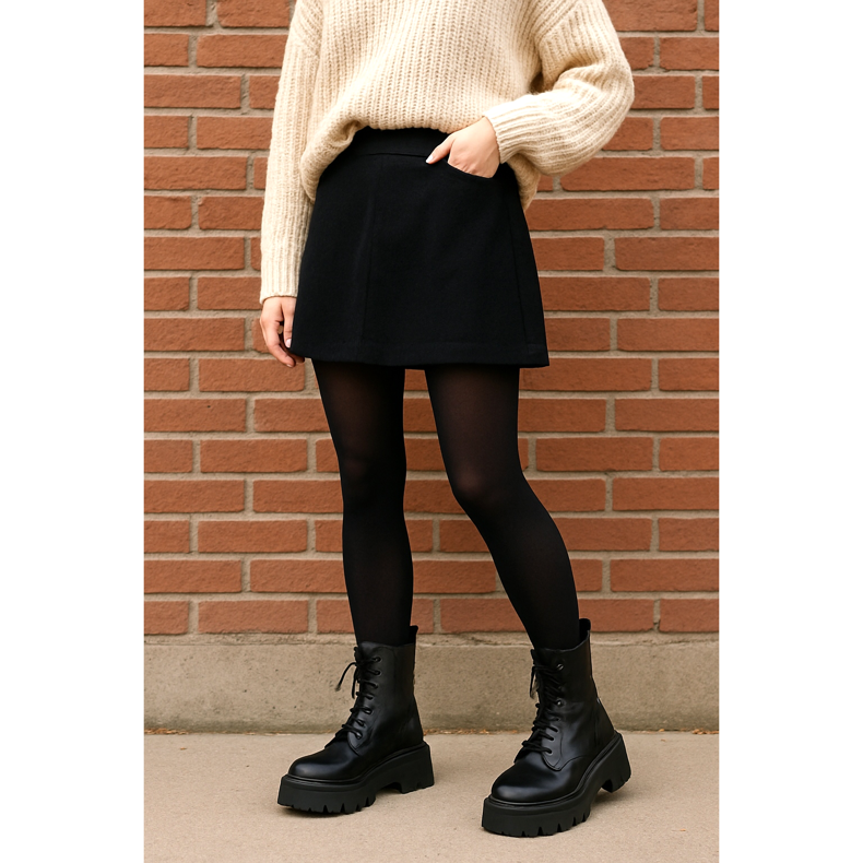Las botas gruesas también quedan muy bien con minifaldas cortas. Para evitar un efecto vulgar, elija medias negras gruesas (opacas) y una blusa más holgada, p. un suéter de punto grueso metido parcialmente detrás del cinturón. La suela gruesa estiliza visualmente las piernas y la parte superior alta aporta carácter. Este es el estilo perfecto para paseos otoñales o reuniones con amigos.