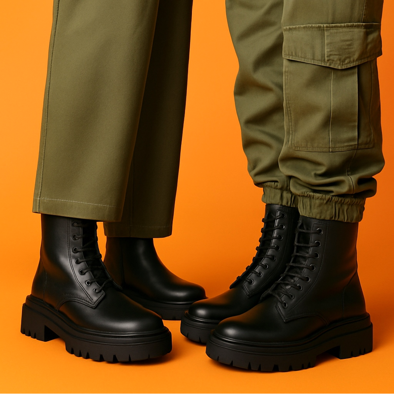 Si prefieres los pantalones, las botas gruesas quedan mejor con modelos de pierna recta o ancha que caen ligeramente sobre el zapato pero no lo cubren por completo. También puedes meter las perneras de los pantalones por dentro (estilo militar) si tienes pantalones cargo o joggers. Evita combinarlos con tubos muy ajustados, a menos que quieras conseguir el efecto "pegarse en el zapato".