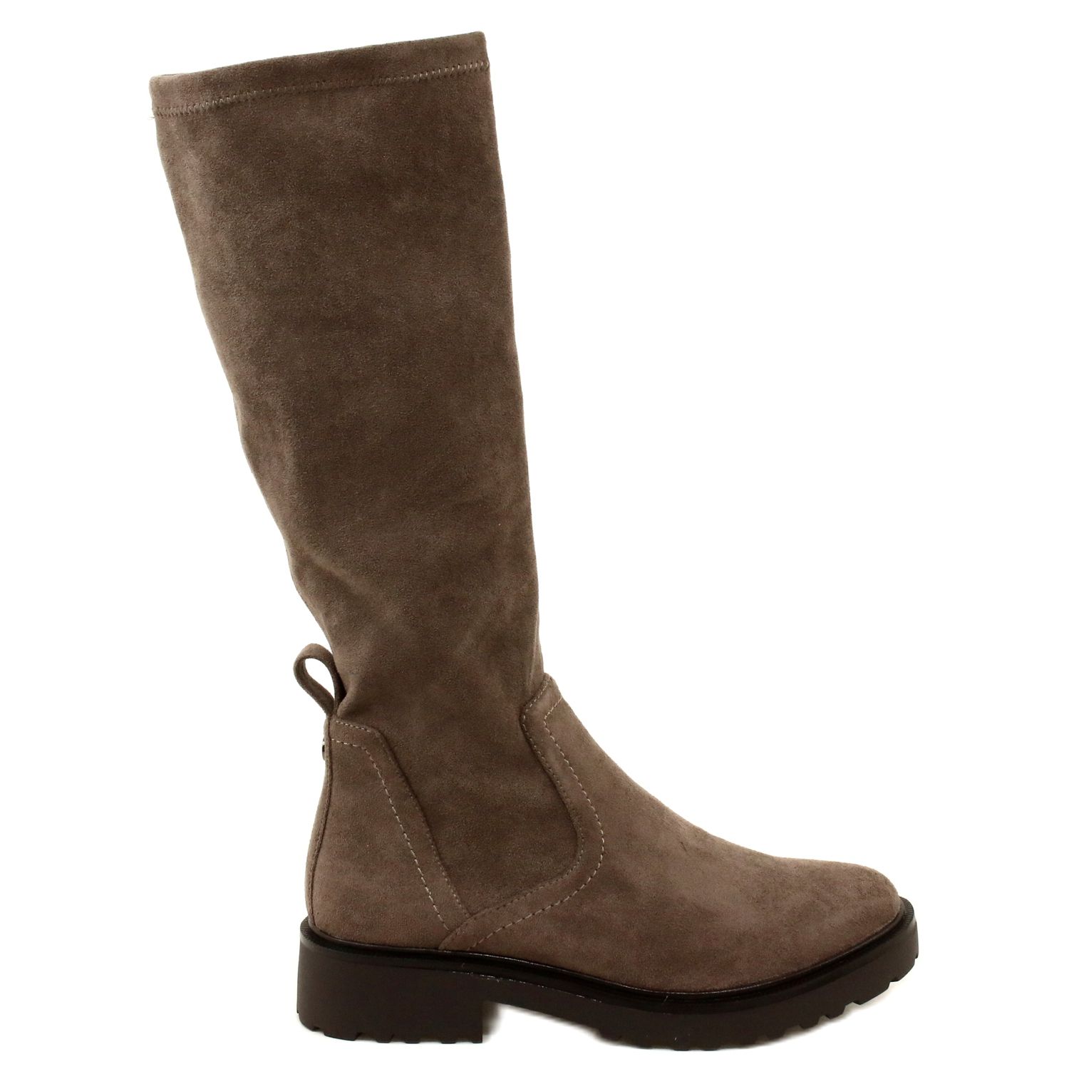 Botas de café elegantes en café, hechas de material de gamuza estirable, que se adapta de manera flexible al ternero. El corte clásico con una nariz redondeada y un talón estable de 4 cm hace que la figura parezca más delgada, y caminar permanece cómodo todo el día.