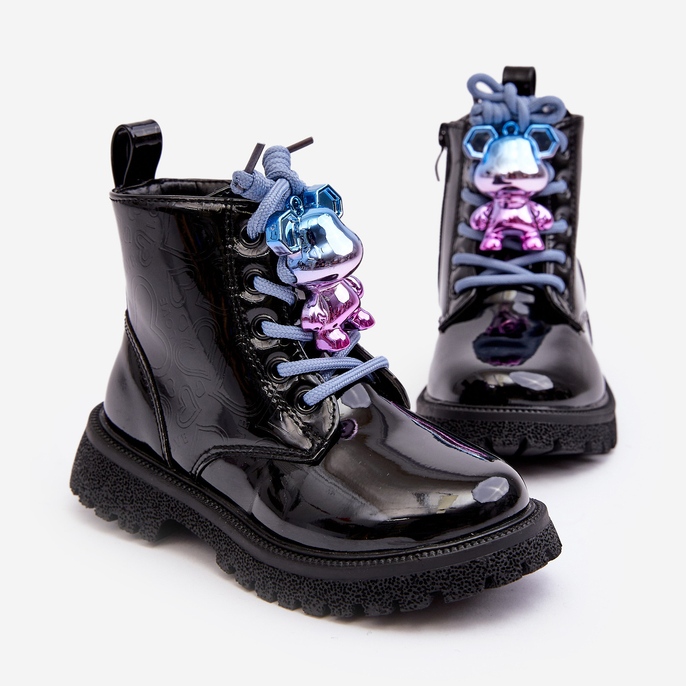Las botas están fabricadas en piel ecológica y acabadas con barniz, lo que les da un aspecto elegante. En la suela hay una decoración realizada en material de goma, dando al calzado un carácter único. Las botas están aisladas, lo que las hace perfectas para los días más fríos. Se pueden abrochar con una cremallera o atar con cordones para ajustes de soporte adicionales.
