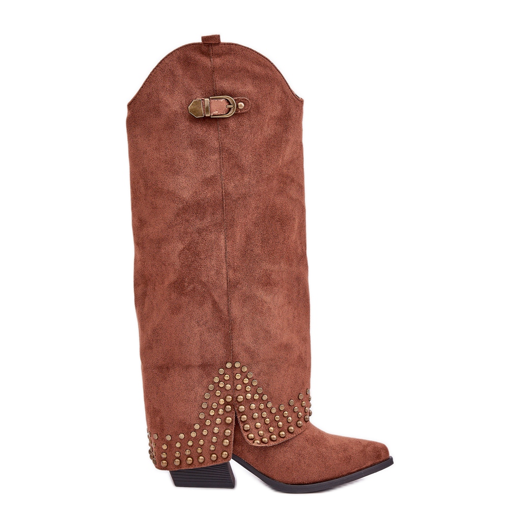 Las botas con una parte superior elevada en un poste marrón es una propuesta ideal para las mujeres que desean combinar el estilo de moda con comodidad. Hecho de gamuza ecológica de alta calidad, estas botas elegantes se ajustan perfectamente a las tendencias actuales, al tiempo que ofrecen el diseño original gracias a una parte superior elevada, decorada con diamantes de imitación y una hebilla elegante.