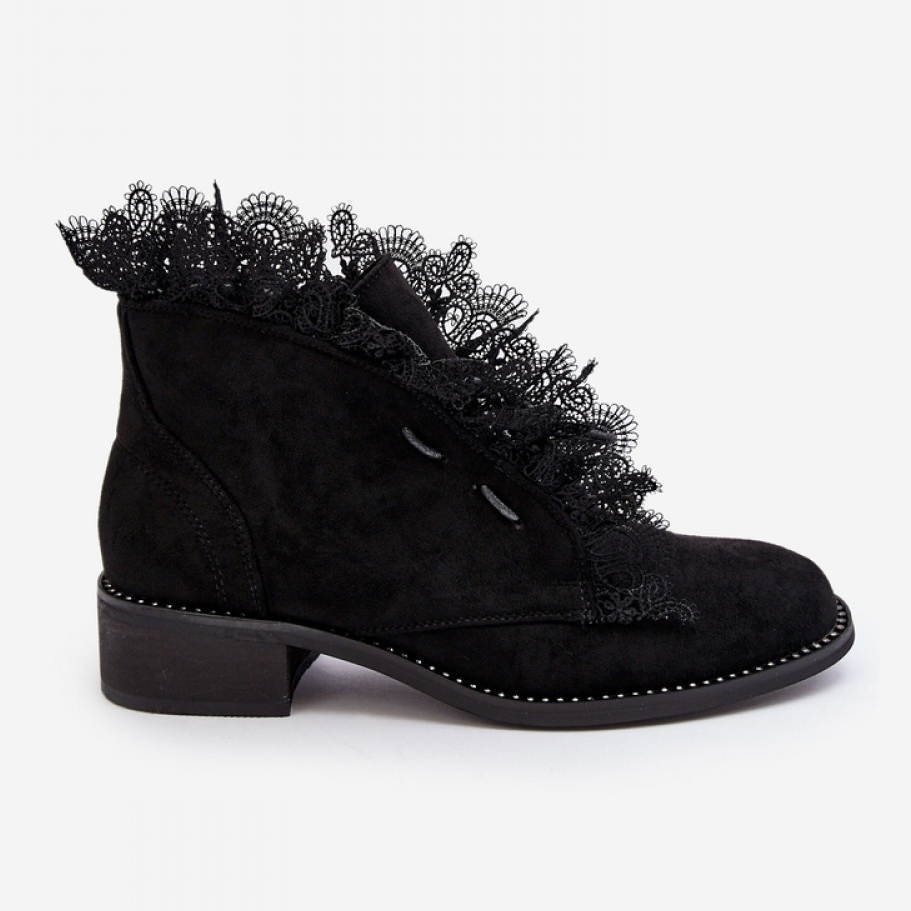 Botines de mujer. Con tacón plano. Dedos redondeados. Se cierra con cremallera en el lateral y cordón adicional en la parte delantera. El interior está aislado con una manta para zapatos. Parte superior decorada con encaje. Además, este modelo tiene un tacón rígido.