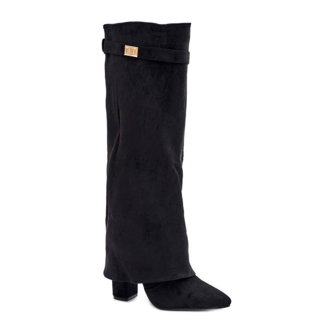 Estas botas tienen un tacón de bloque estable de 11 cm de altura, lo que garantiza comodidad y una excelente postura. Los dedos en punta añaden elegancia y elegancia, y la parte superior enrollada con una correa desmontable le da al conjunto un carácter único. El interior está aislado con una manta para zapatos que hace que este modelo sea perfecto para los días más fríos.