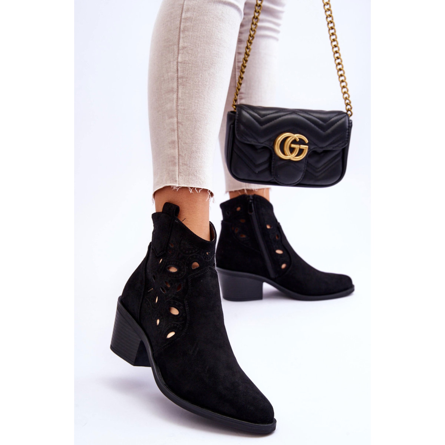 Las botas de vaquero en un poste masivo aseguran la estabilidad durante el uso. Cierre con cremallera en el lateral de la parte superior. Tienen un talón rígido. Confeccionado en ante ecológico con un moderno patrón calado. Las botas vaqueras serán un gran complemento para muchos estilos. Puedes llevarlos, entre otros, con vestidos camiseros, faldas vaporosas o pantalones vaqueros.