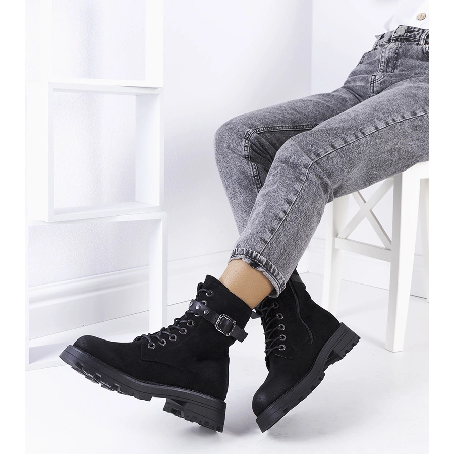 Elegantes botines universales, hechas de cuero ecológico de gamuza. El modelo Narnclaedra combina un personaje de cazadores de moda y de moda con soluciones prácticas: una suela gruesa con un protector asegura la adhesión y el calentamiento se preocupa por el confort térmico en la temporada de otoño/invierno. El sujetador de la cremallera en el interior hace que sea más fácil poner rápidamente, y el cordón en el frente le permite combinar la parte superior. La correa sutil con una abrazadera decorativa en color plateado agrega carácter.