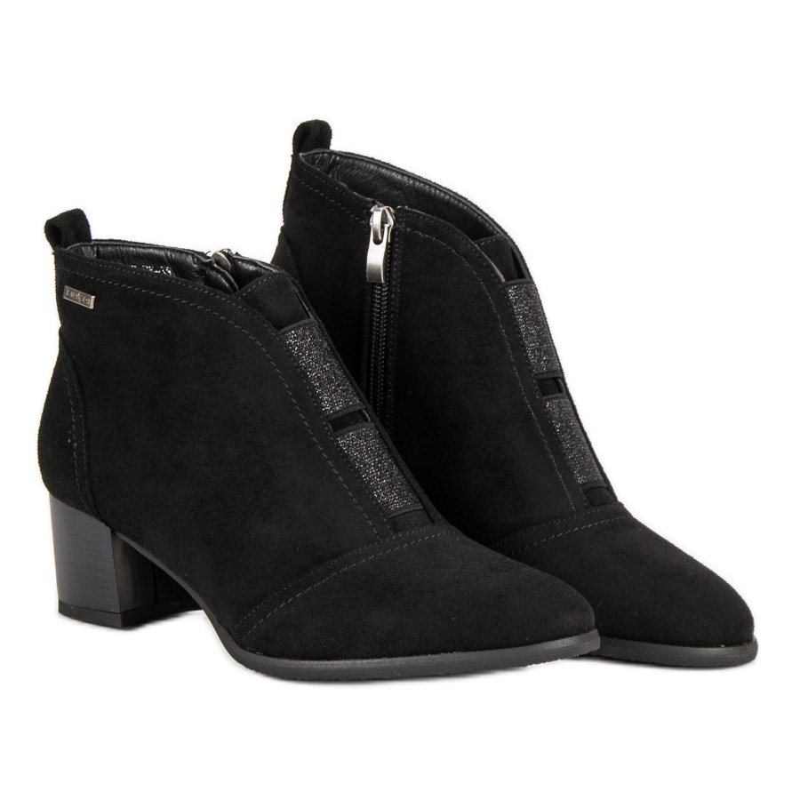 Los elegantes botines Filippo negros son la elección perfecta para las mujeres que valoran una combinación de comodidad y elegancia. Hechos de gamuza ecológica de alta calidad, no solo lucen a la moda, sino también con estilo. Su elemento característico es un tacón tipo bloque de 5 cm de altura, que garantiza estabilidad y comodidad en el uso diario.