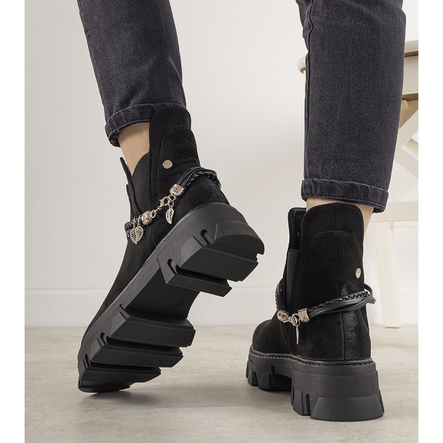 Las botas negras con pulsera Fearless son la elección perfecta para la próxima temporada otoño-invierno. Estos elegantes zapatos, fabricados en piel serraje ecológica de alta calidad, combinan elegancia y carácter único. Su efecto desgastado en la puntera les aporta originalidad y la suela alta y estampada las hace llamativas.