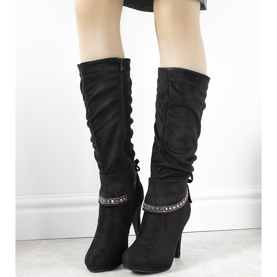 ¡Lleva tu estilo al siguiente nivel con las botas negras de tacón Lemelin! Estos zapatos sumamente elegantes combinan un corte clásico y detalles modernos que llaman la atención. Los adornos de circonita les confieren un brillo fenomenal, gracias al cual cada momento que pases en ellos se convertirá en una experiencia única.