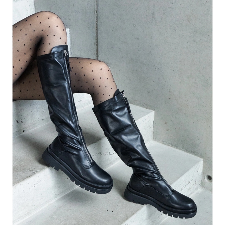 Inna marka Botas negras de ecopiel con tacón plano decoradas con cremallera. negro