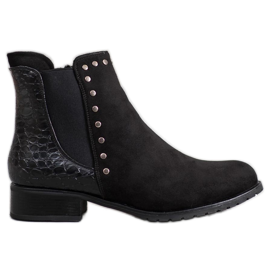 Aquí está la elección perfecta para toda mujer que quiera combinar moda con comodidad: los modernos botines negros SHELOVET. Estos originales botines son un complemento perfecto para muchos estilos cotidianos, al tiempo que garantizan la comodidad de uso. La parte superior hecha de material similar al ante, decorada con pedrería plateada, llama la atención y aporta un carácter único a los zapatos. La parte trasera de las botas con motivo de piel de cocodrilo aporta un toque de elegancia y estilo.