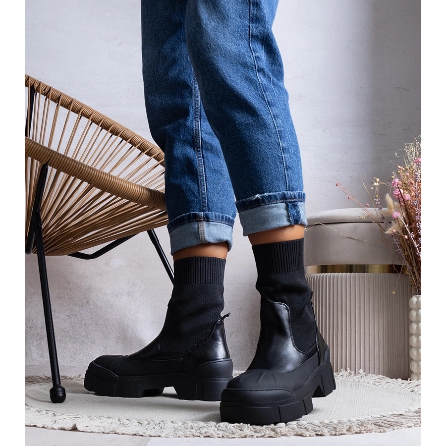 Las botas contagelas elegantes y universales son un complemento perfecto para las estilizaciones urbanas cotidianas. Las prensas decorativas en la nariz les dan carácter, y los colores negros clásicos los hacen que se ajusten a muchos juegos.