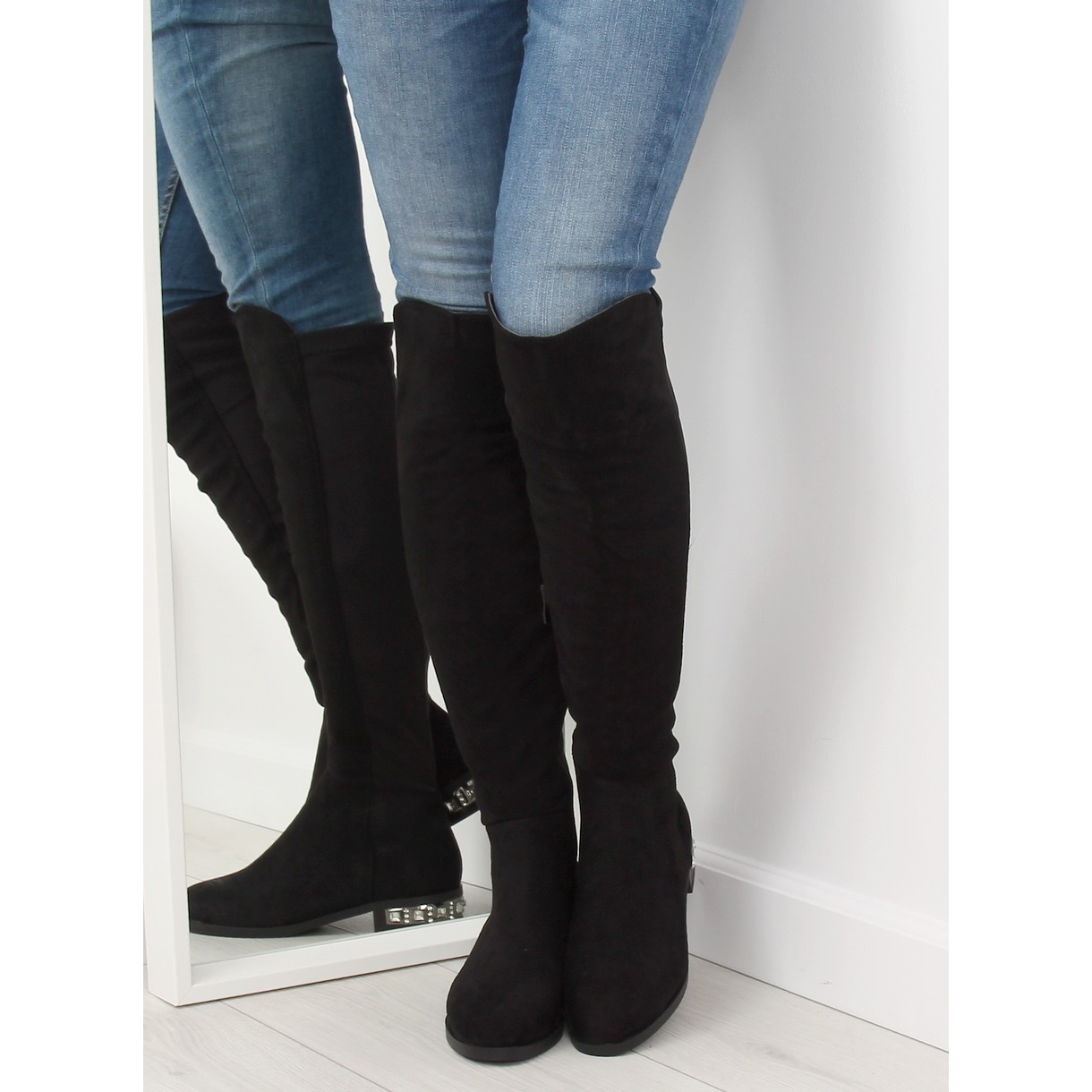 Muslo femenino en un clásico color negro. Su diseño atemporal ha sido destacado por un tacón bajo tachonado con piedras brillantes que le da un efecto único ... Un acento interesante y cómodo es también un inserto flexible en la parte posterior, gracias al cual los zapatos se ajustan perfectamente a la pantorrilla, y una práctica cremallera facilitará la colocación. ¿Qué más puedes pedir? :) Están hechos de gamuza ecológica, y el interior está forrado con un pelaje delicado.