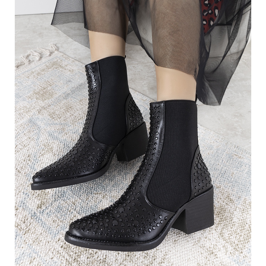 Gracias a la pedrería decorativa negra, los botines Camus destacan sobre otros modelos, llamando la atención y aportando un toque diferente a todo el estilismo. La punta puntiaguda y la parte superior ajustada adelgazan ópticamente las piernas, lo que las convierte en la elección perfecta para diversas ocasiones, desde reuniones informales hasta salidas elegantes.