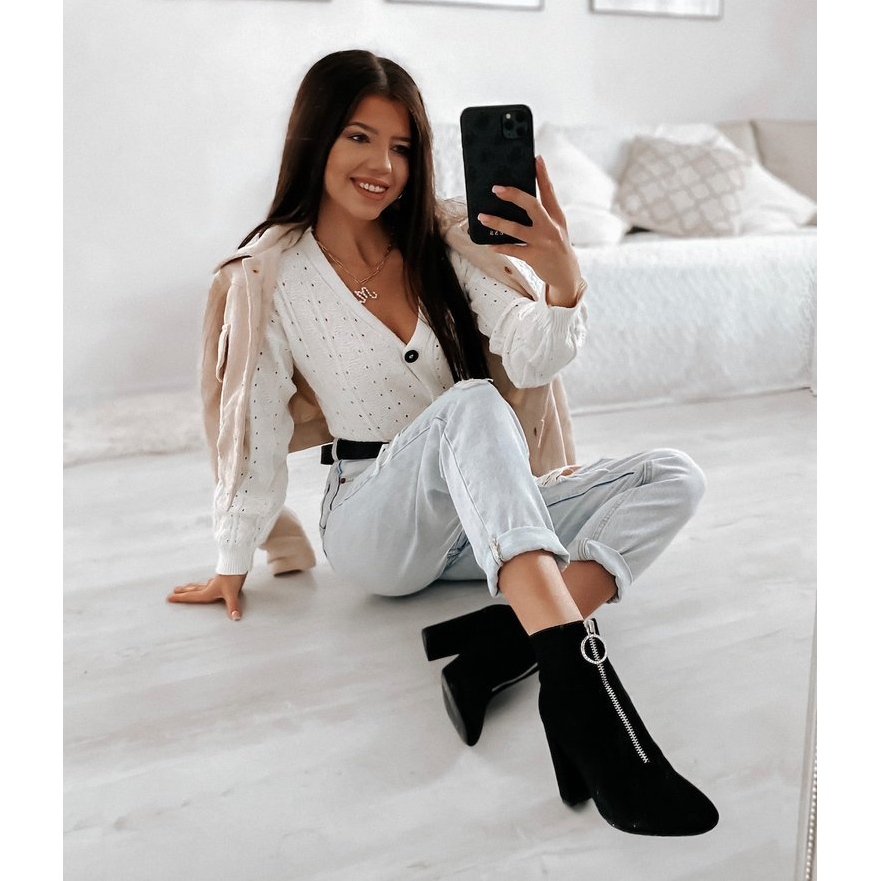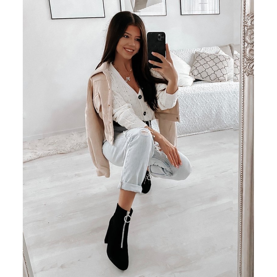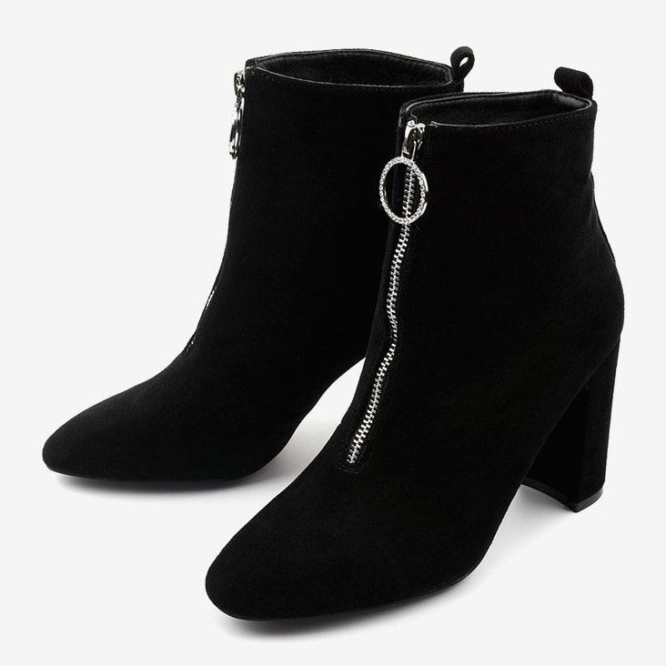 Las botas de moda y elegantes de KeeShoes están hechas de cuero negro, ante y ecológico. La suela es de material sintético y las plantillas son de piel ecológica. Los zapatos se abrochan con cremallera. El tacón en bloque mide 9 cm. Los botines llegan por encima del tobillo. Perfecto para el clima de otoño e invierno.
