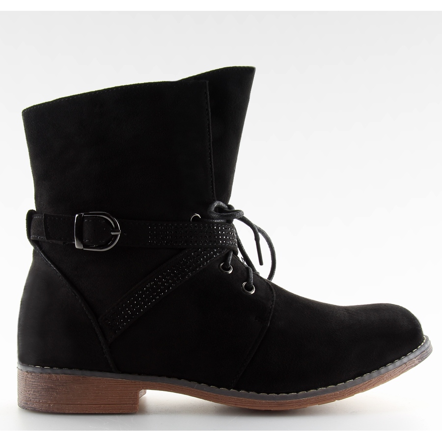 Botas de mujer en tacones planos. Tienen el corte original de la parte superior decorado con una correa con circonamiamic fino, que agrega claridad a los zapatos. Están completamente atados, pero ponérselos no causa ningún problema, tienen una lengua ancha en la parte delantera del zapato. Están hechas de gamuza ecológica, en una capa de espuma, por lo que son ideales para temporadas temporales.