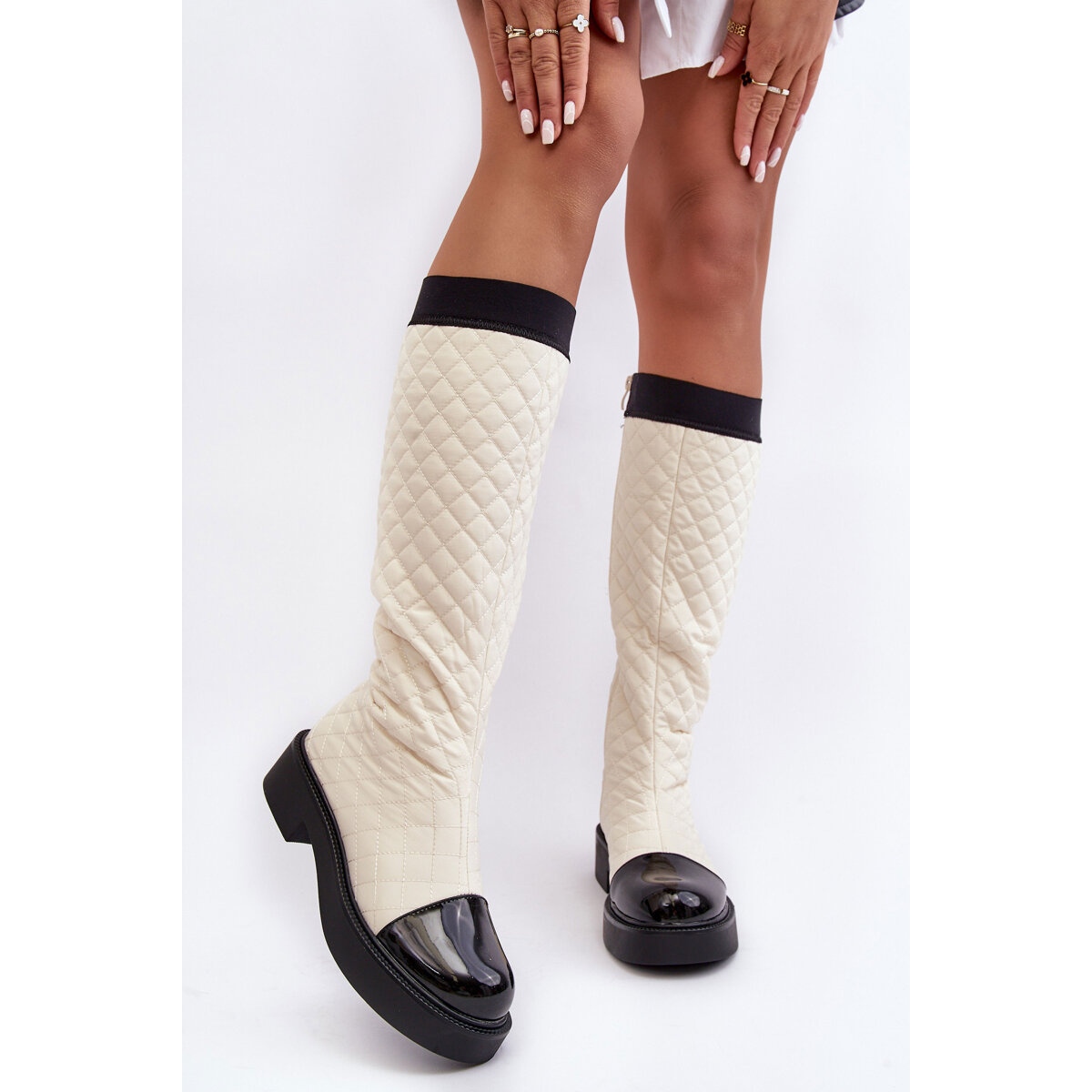 PS1 botas acolchadas frente al beige de rodilla/negro - elegancia y comodidad para los días más fríos.