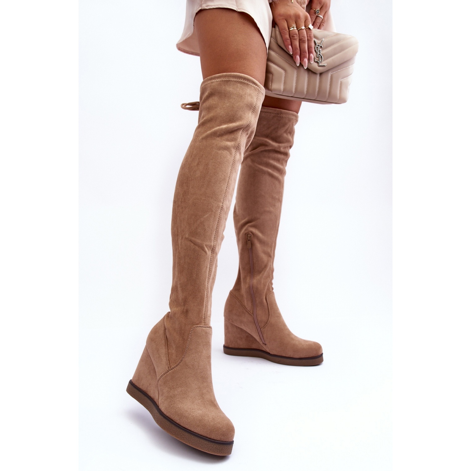 Botas de mujer con pala anudada por encima de la rodilla. Modelo sin cordones, con cremallera adicional en el lateral de la pala. Montado sobre cuña y plataforma. Aislamiento a la altura de los pies. El talón está reforzado. ¡Este estilo único hará las delicias de todos!