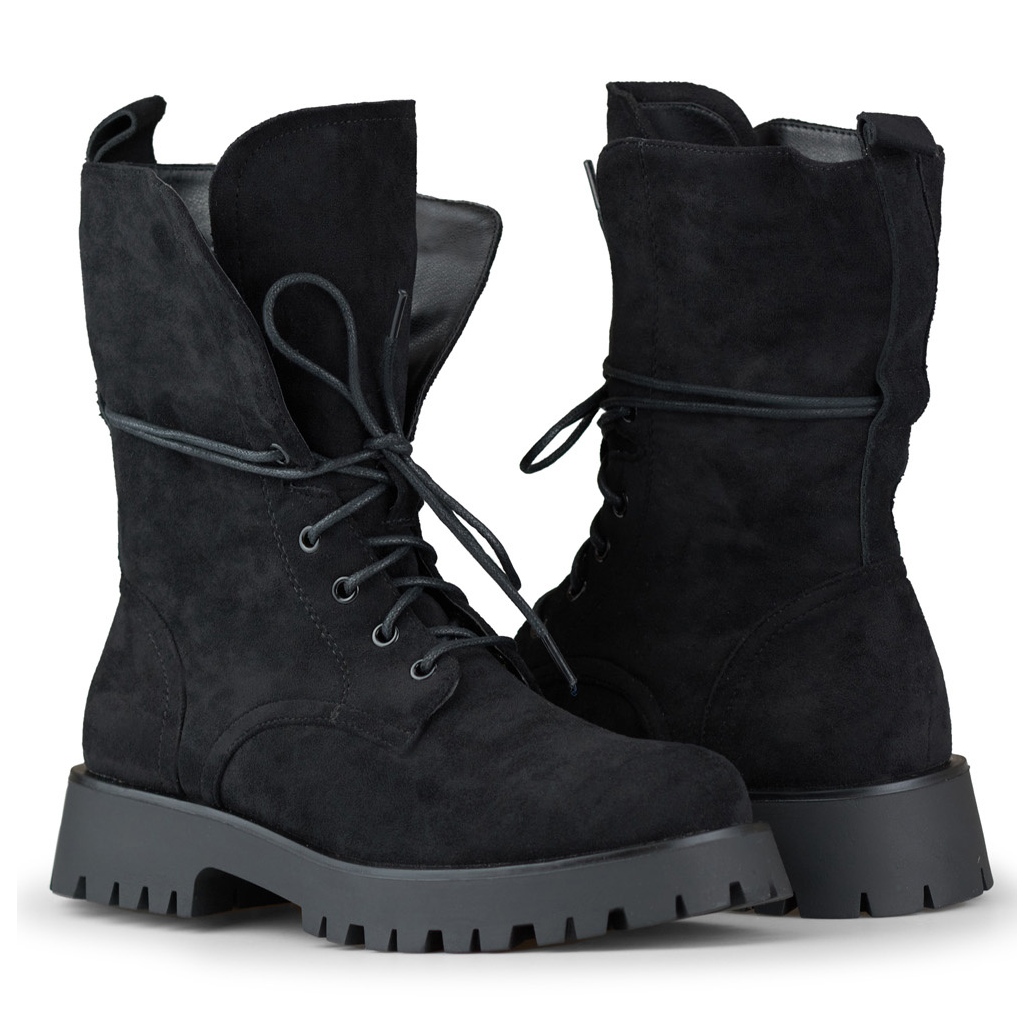 Detalles: Botas trabajadoras con cordones para mujer en ante negro beige
