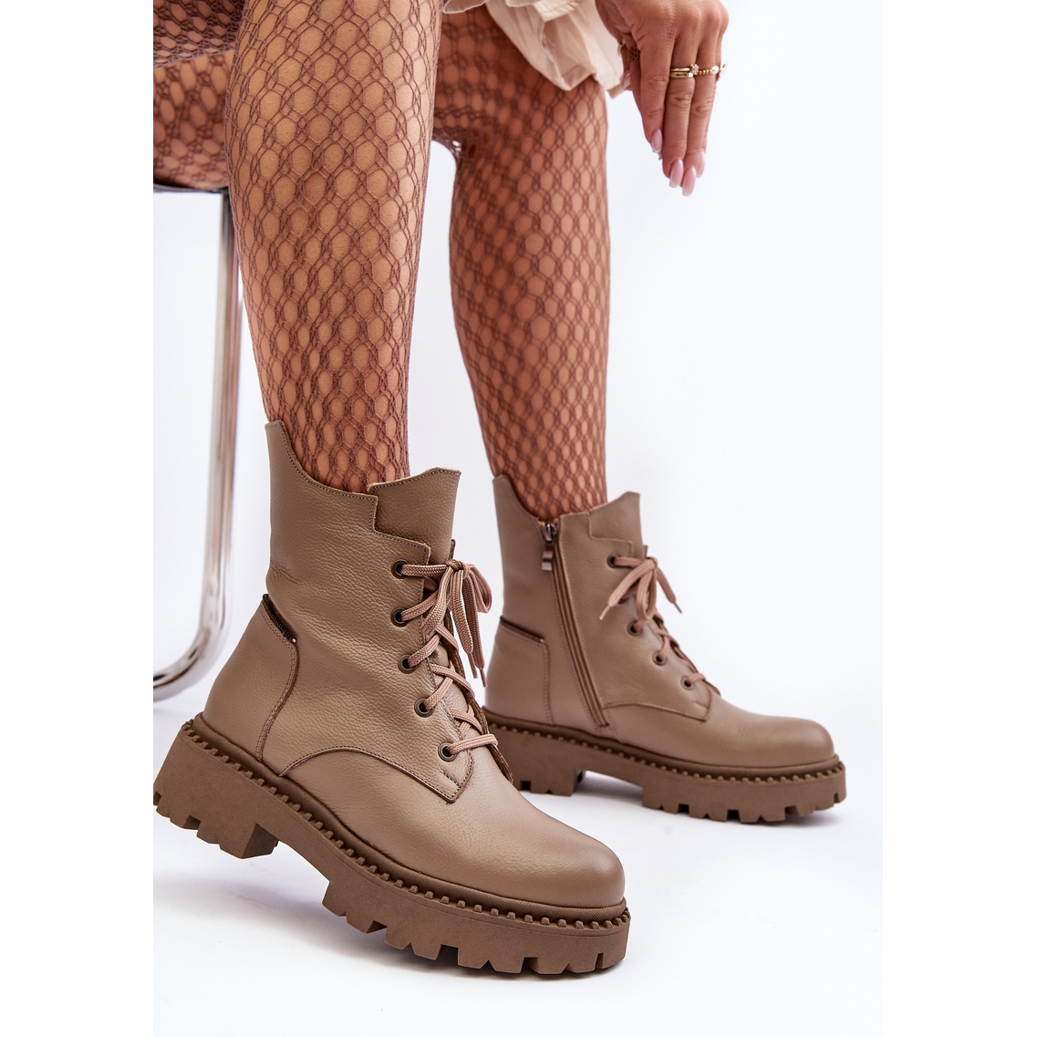 Botas de senderismo para mujeres elegantes y prácticas hechas de cuero natural, perfectas para días más fríos de la colección de otoño/invierno. Un clásico, para el tobillo que alcanza un corte que combina una cremallera y un cordón le da la comodidad de ponerse y un cierto ajuste, y el aislamiento de la manta de calzado proporciona calor incluso en las mañanas más frías.