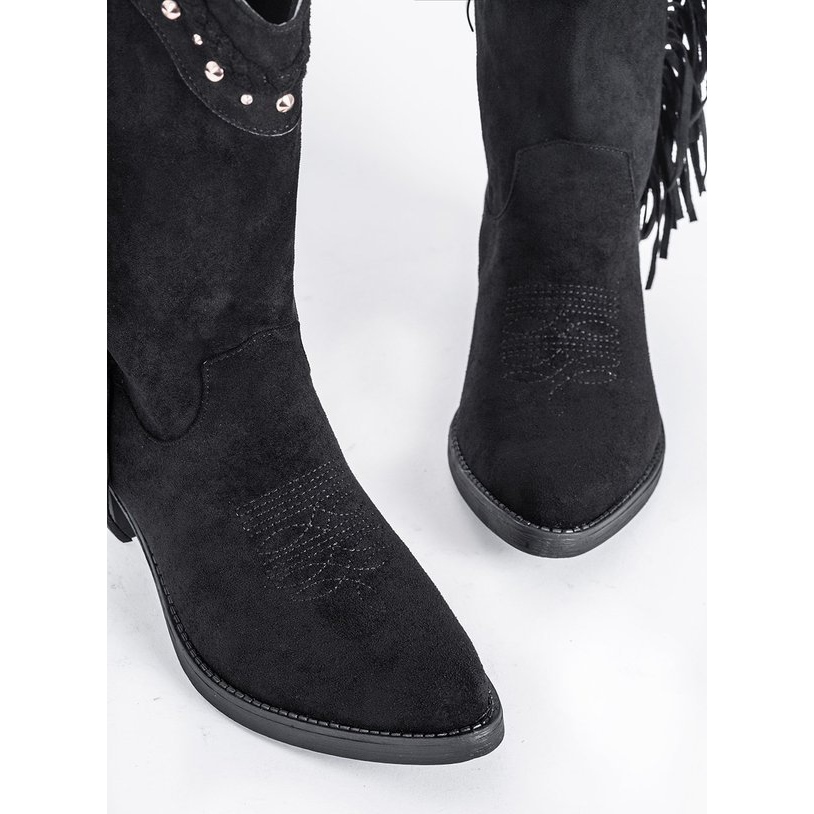 Descubra el último éxito de la temporada: ¡botas cowboy altas negras con pedrería Clover! Estos zapatos extremadamente elegantes son una combinación de elegancia y desenfado, que encajan perfectamente en las tendencias de primavera y otoño. Decorados con flecos y espectaculares pedrería dorada, llaman la atención y enfatizan el estilo individual de cada mujer.
