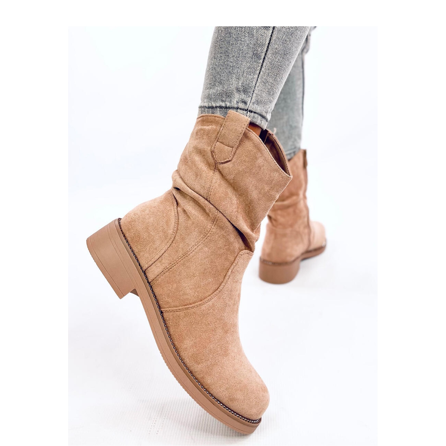 Botas planas de mujer de ante. Tienen un corte clásico con una parte superior con volantes a la moda y una suela tachonada de pedrería. ¡Tienen ese "algo"! El práctico cierre de cremallera garantiza una colocación rápida y sin problemas. Están confeccionados en ante ecológico y el interior está forrado con una delicada piel.