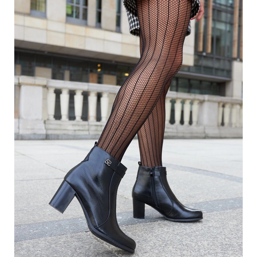 Elegantes y prácticas: las botas Barreto combinan un diseño de moda con la comodidad del uso. La parte superior de cuero ecológico negro decorado con circones sutiles le da estilo de zapatos y un personaje universal, que se adapta a las estilizaciones cotidianas y más iniciales. El dedo del pie de almendra y un talón estable en un pilar de 6 cm de altura proporcionan un aspecto elegante sin renunciar a la comodidad.