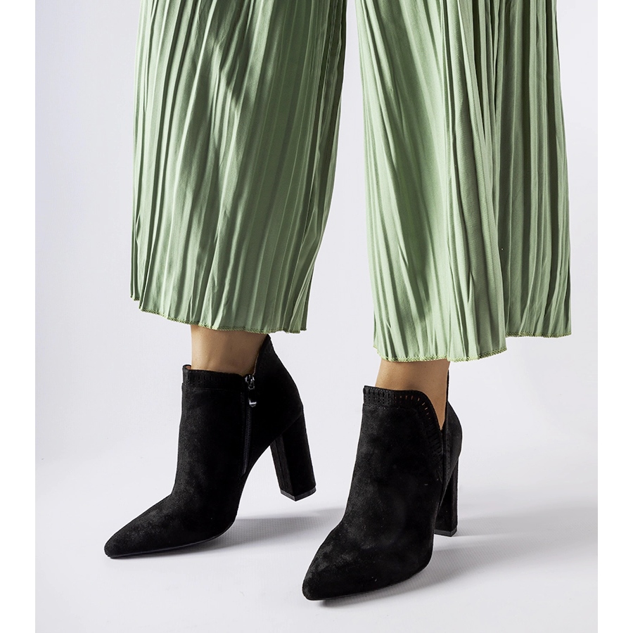 Corto, las botas Cammoro A8705 de mujeres hechas de cuero de gamuza ecológica en un color negro clásico. El modelo de tobillo con una nariz decorativa y delgada y un talón de tipo de talón estable funcionará en estilizaciones cotidianas y más elegantes. El cierre de cremallera hace que sea más fácil de poner, y el calentamiento proporciona comodidad en los días más fríos.