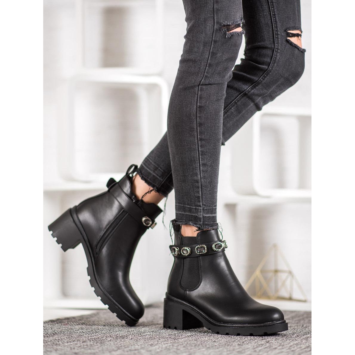 Un tacón ancho de 5,5 cm de altura garantiza estabilidad y comodidad durante las actividades diarias, y la punta redonda añade elegancia. El original detalle en forma de correa decorativa con pedrería masiva distingue estas botas del resto de modelos, aportando carácter a cualquier estilismo. El elástico ancho en los laterales no solo afecta la estética, sino que también garantiza la comodidad de uso.