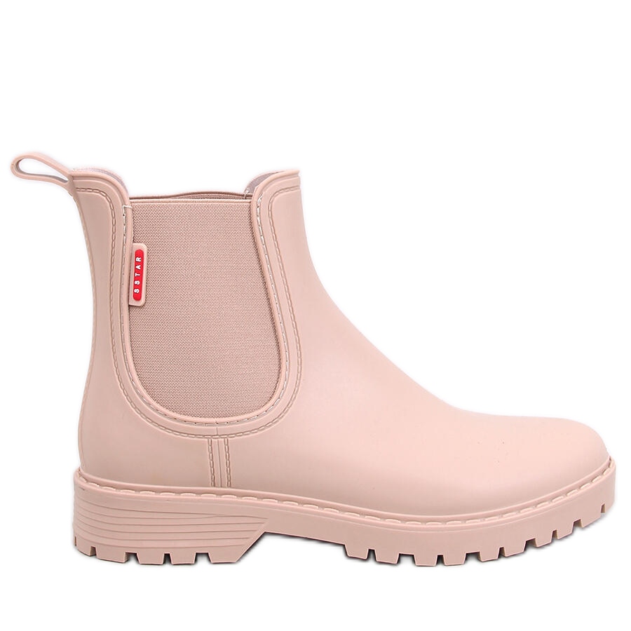 Botas de goma de mujeres con daga cortada en un tono sutil y mate de beige. El corte clásico con inserciones flexibles en los lados facilita la colocación rápida y cómoda. Para el tobillo, con una nariz redonda y una suela plana, perfecta para caminar bajo la lluvia y las estilizaciones prácticas cotidianas.